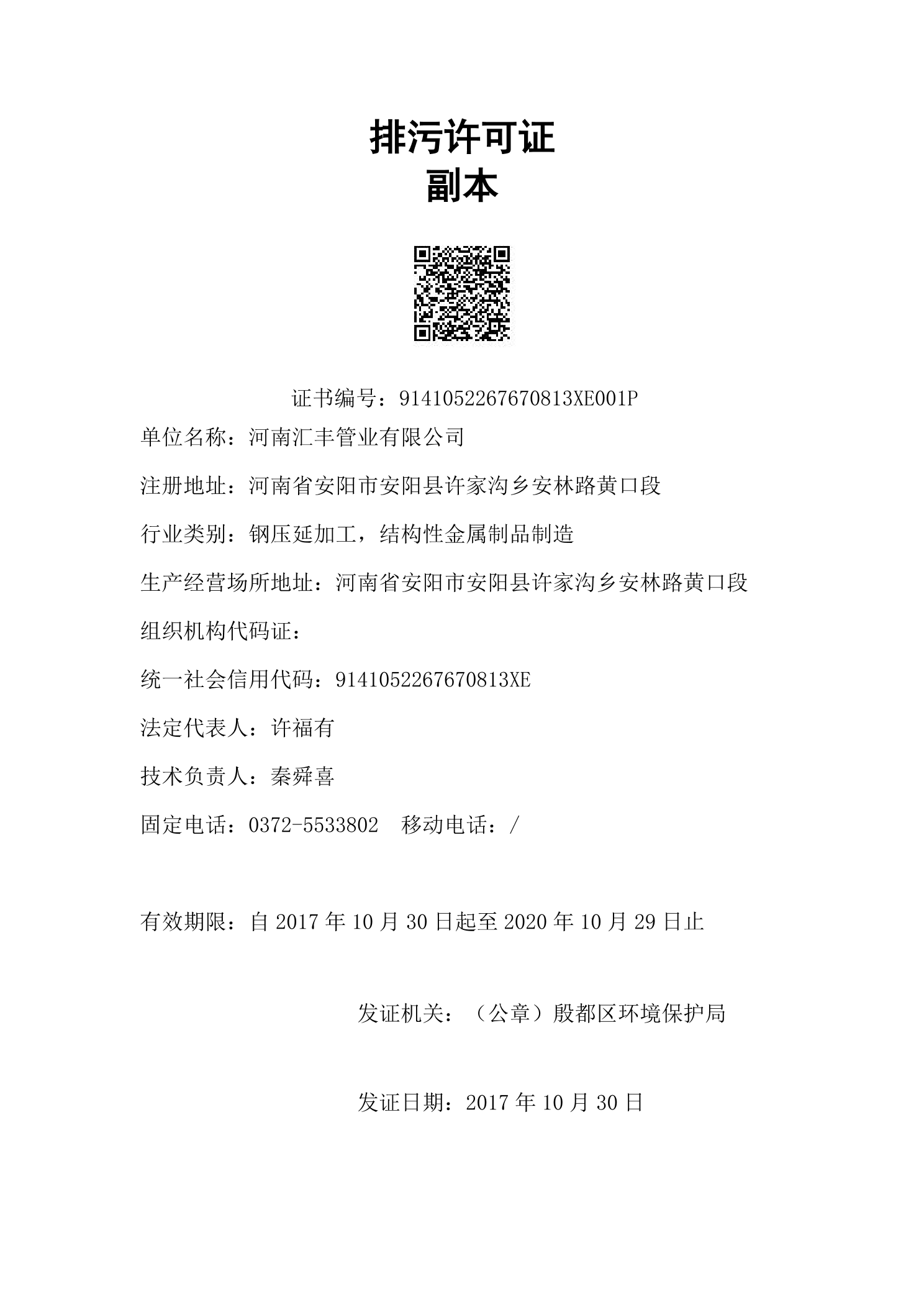 河南彙(huì)豐(fēng)管業有限公司排污許可證